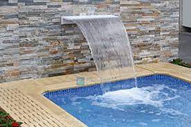 Стеновой водопадвыполнен из нержавеющей полированной стали и является декоративными элементами бассейнов и прочих искусственных водоёмов и аквасистем. Вода с помощью насоса забирается из бассейна, далее подается по трубам на водопад и через сопла различной формы достигается большой напор струи. Поток воды оказывает массирующий эффект на шею, спину, голову.